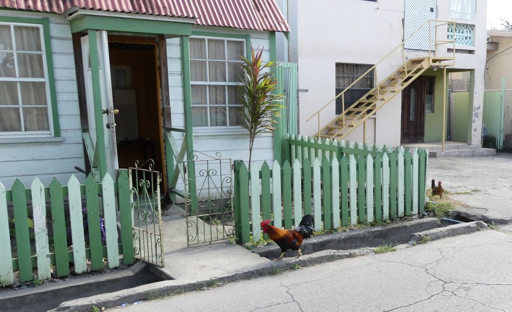 Wie auf allen Inseln der Kleinen Antillen sieht man auch hier Geflügel, das frei herum läuft.